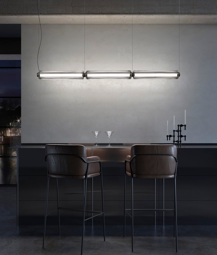 Sospensione modulare in cristallo con lavorazione rigadin e sorgente LED. Elementi allungati e a goccia combinabili in tre configurazioni diverse. Da accesa rivela linee fluide e dinamiche, da spenta è una scultura luminosa di grande impatto. Perfetta per chi cerca un design elegante e moderno.