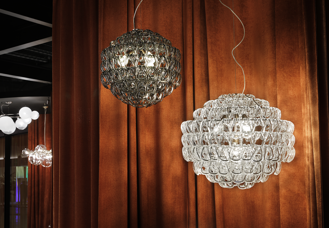 The glass hook, a key element of the collection, reinvents the tradition of Venetian chandeliers with a contemporary twist. Giogali is available in ceiling, suspension, wall and table versions, and lends itself to customised compositions that interact with the space in a fluid and dramatic way.