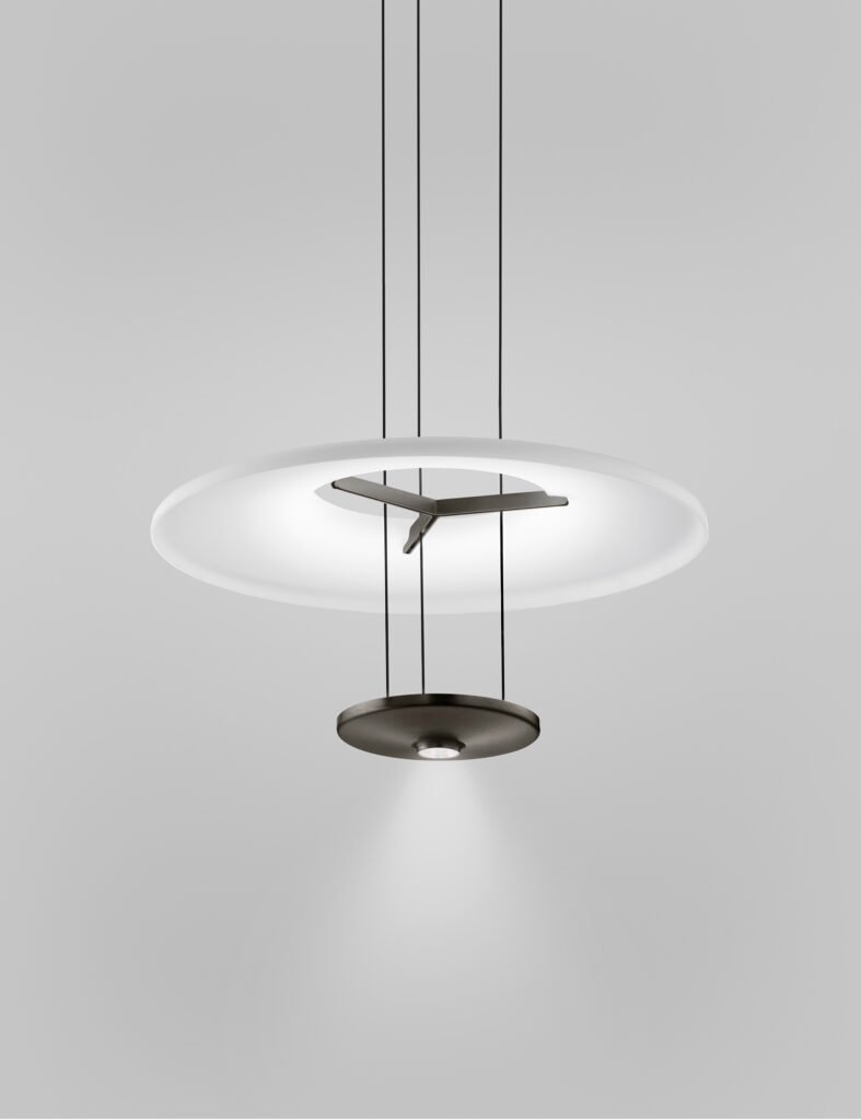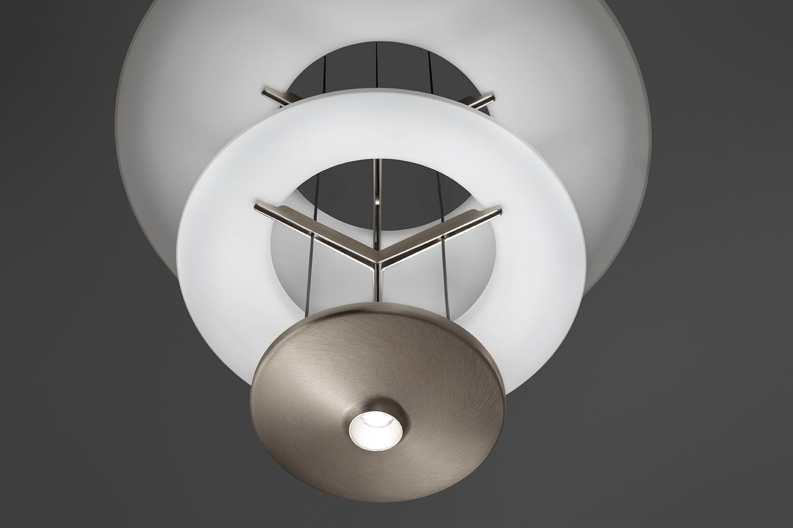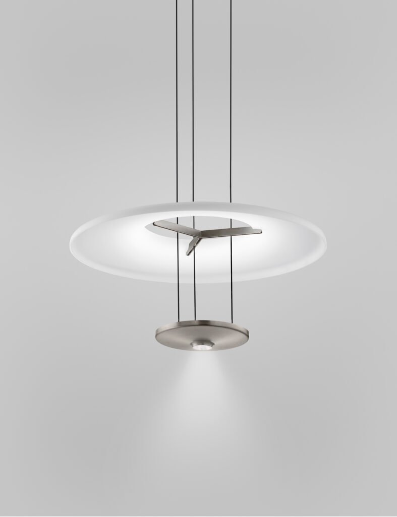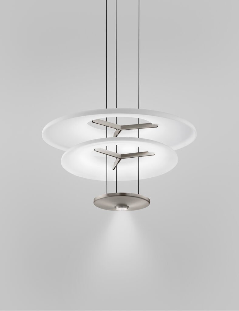 Due dischi in vetro bianco satinato di diverso diametro possono essere combinati insieme o utilizzati singolarmente ad un terzo elemento posto alla base, che custodisce le due sorgenti LED integrate gestibili separatamente.
