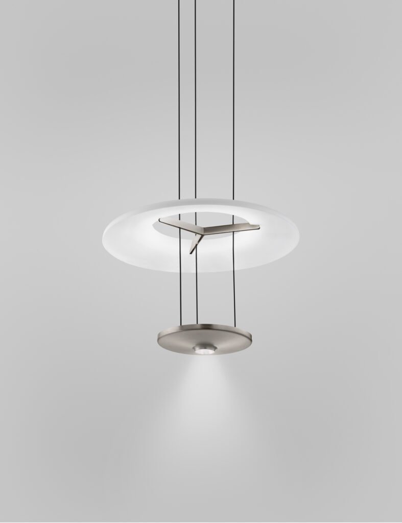 Articoli a sospensione disponibili con finitura montatura nickel nero satinato o acciaio satinato.