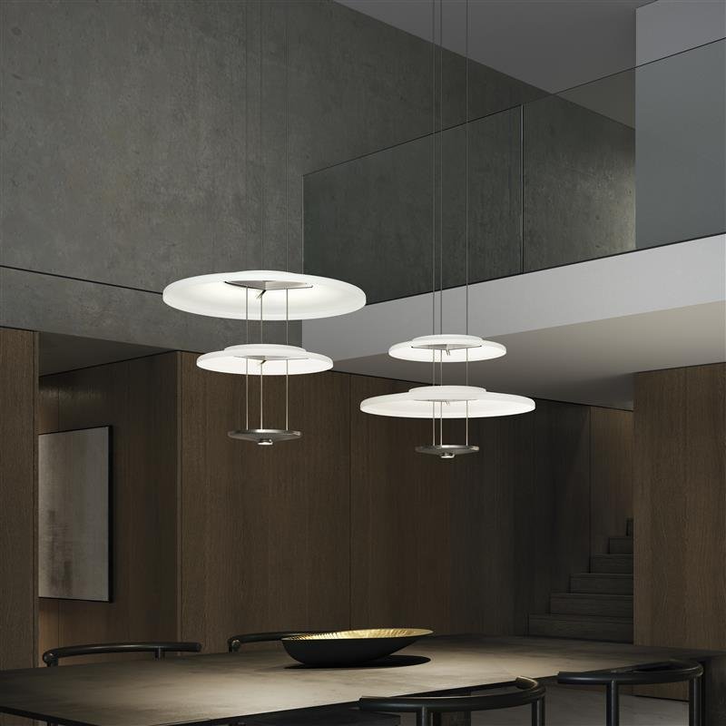 I due elementi in vetro sono regolabili in altezza grazie a un sistema di aggancio che scorre lungo i cavi, permettendo configurazioni sempre diverse, anche con un solo diffusore dando vita a forme ed equilibri sempre nuovi.