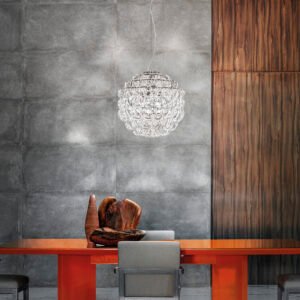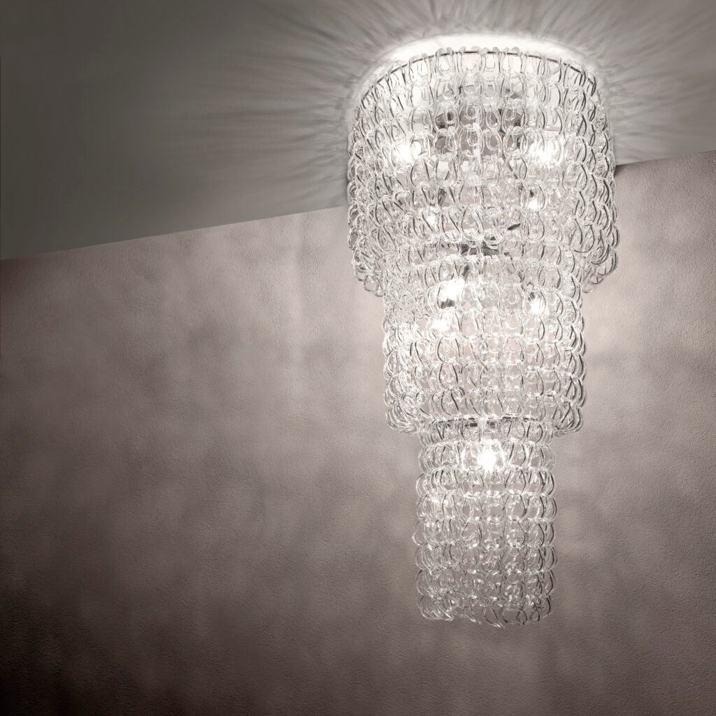 Il progetto si fonda su un singolo modulo in vetro lavorato a mano, che può essere agganciato in sequenza per creare catene di cristallo e strutture luminose dalle forme libere e scenografiche. Da questo principio nasce un vero e proprio sistema componibile: i ganci si intrecciano tra loro dando vita a composizioni che ricordano cascate di luce, leggere e dinamiche, capaci di adattarsi a spazi e architetture differenti.