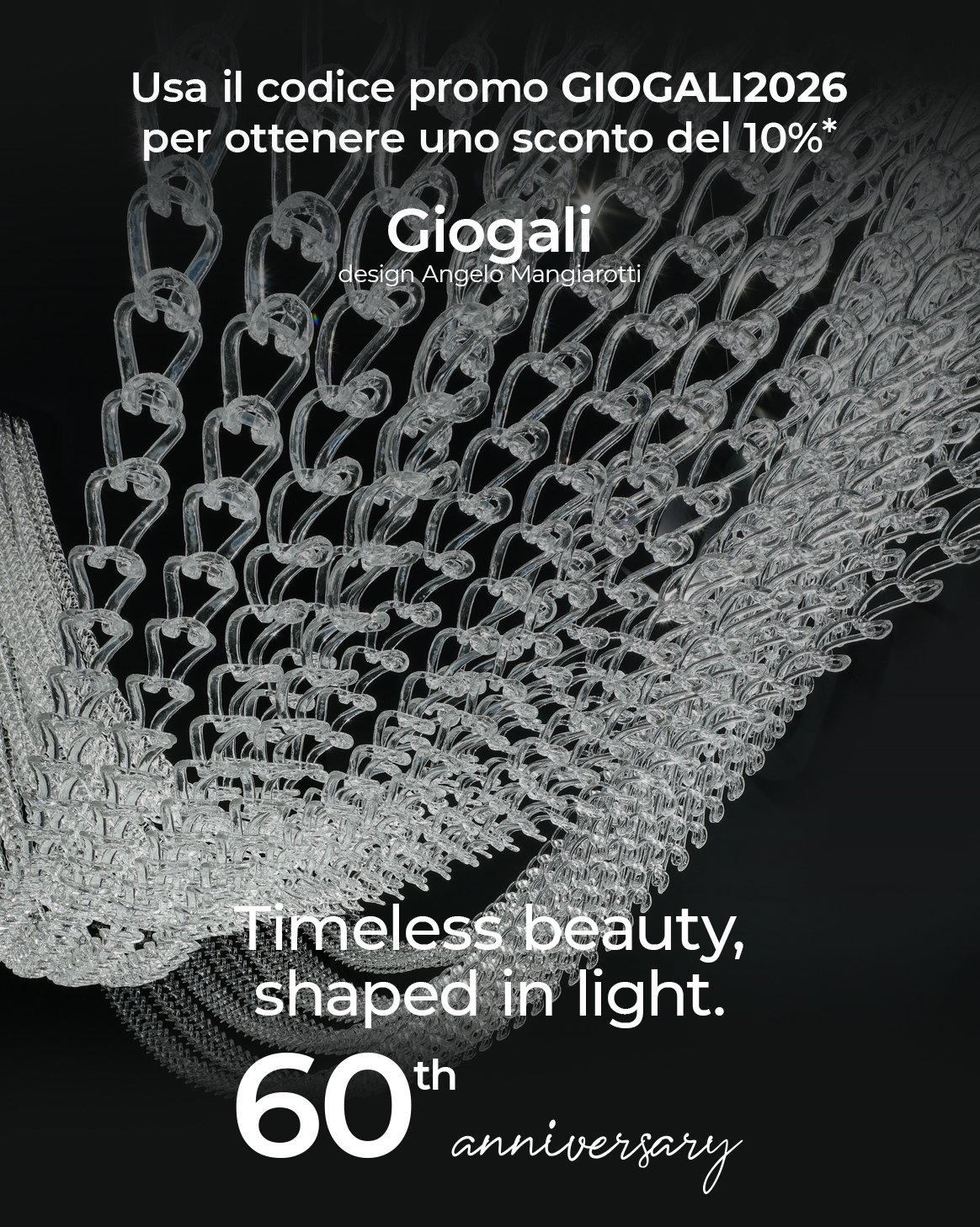 Giogali è una collezione di lampade in vetro che nasce da un’intuizione progettuale semplice e rivoluzionaria: un unico elemento modulare in cristallo, il gancio, capace di generare infinite composizioni luminose. Disegnata nel 1967 da Angelo Mangiarotti per Vistosi, la collezione rappresenta una delle icone più riconoscibili del design italiano, capace di reinterpretare in chiave contemporanea la tradizione del lampadario veneziano.