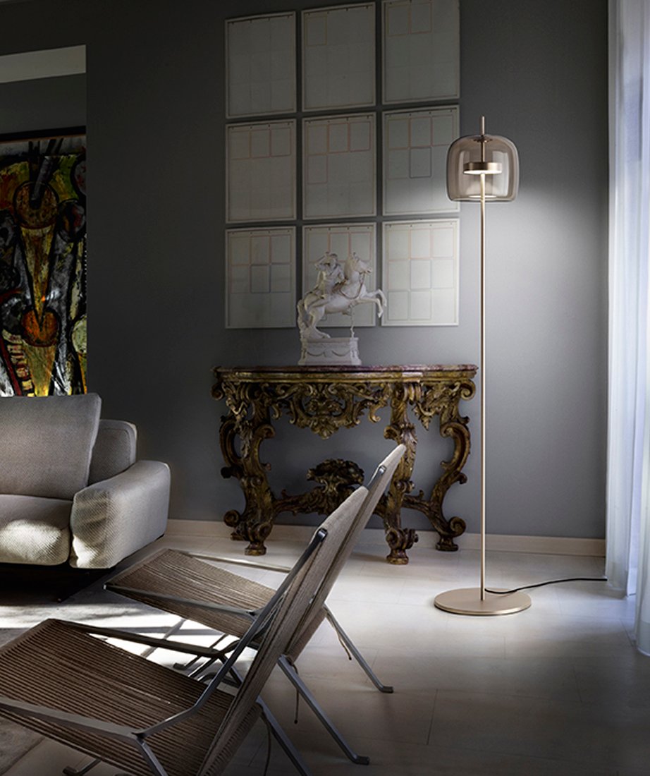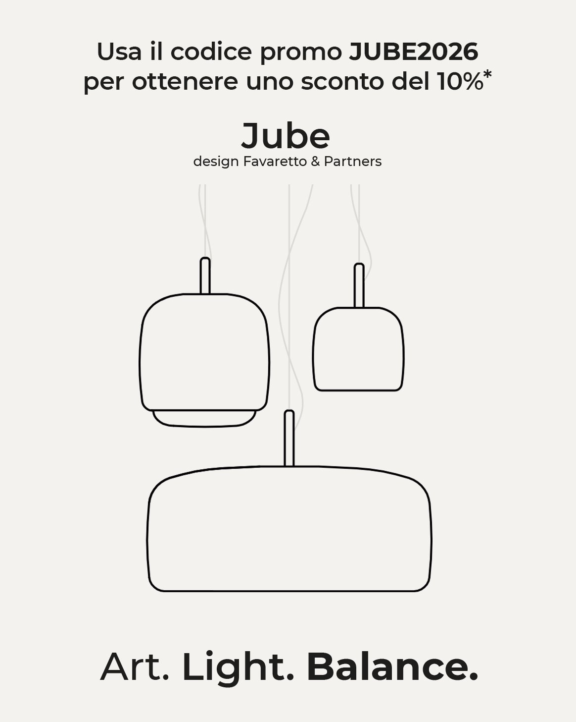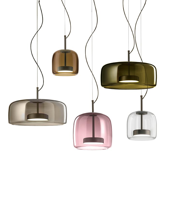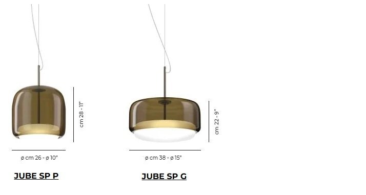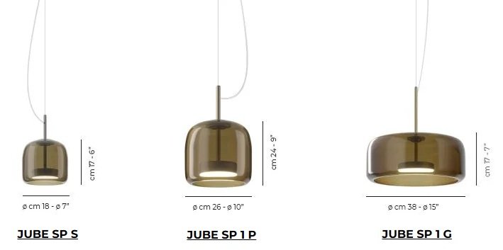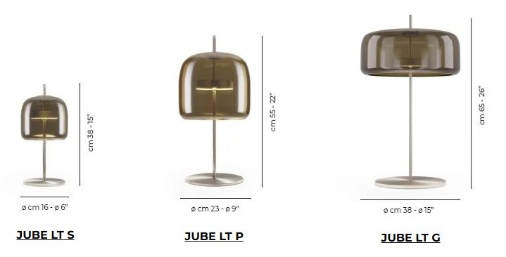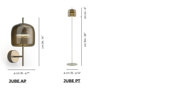 Jube, design Favaretto&Partners, è una collezione dal fascino vintage, composta da quattro tipologie: sospensione, parete, tavolo e terra, tutte con sorgente LED integrata. I diffusori sono disponibili in cinque finiture: ametista chiara, cristallo trasparente, fumè, marrone terra bruciata, verde antico. La montatura presenta tre possibili finiture: acciaio satinato, nero opaco, oro satinato.