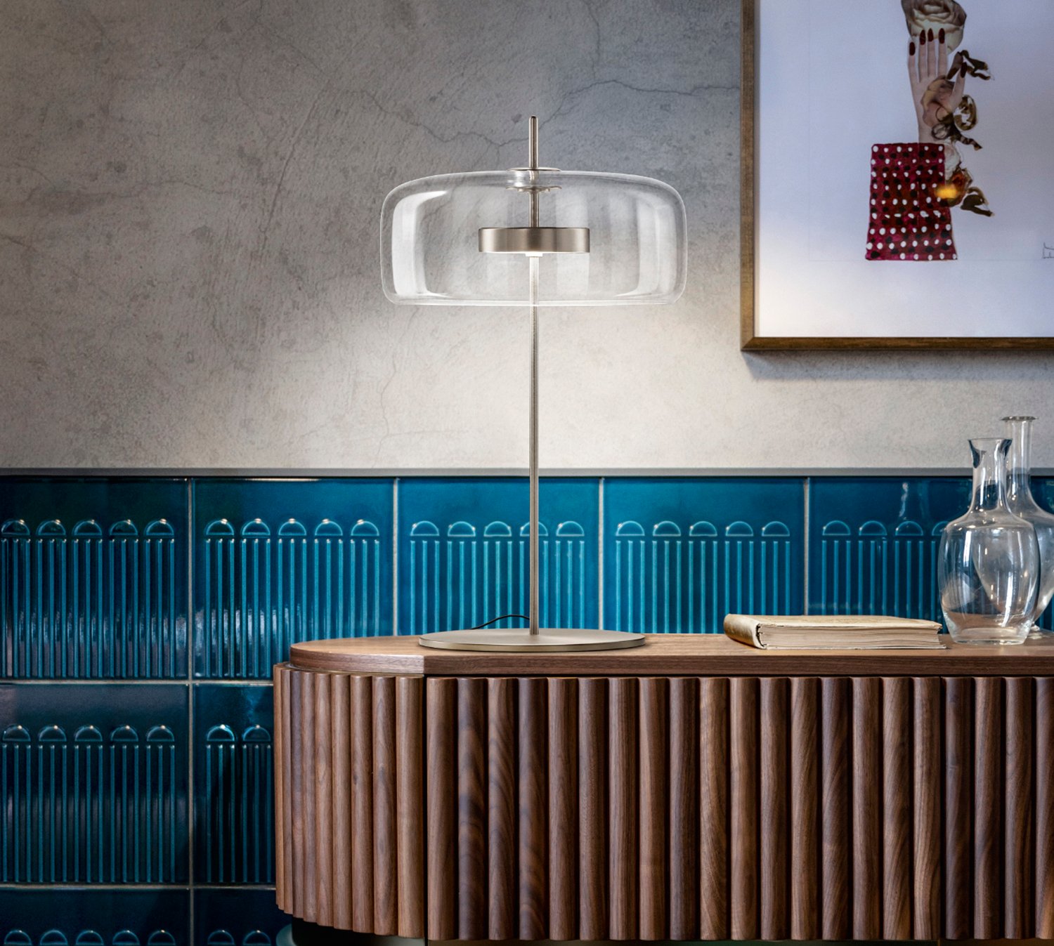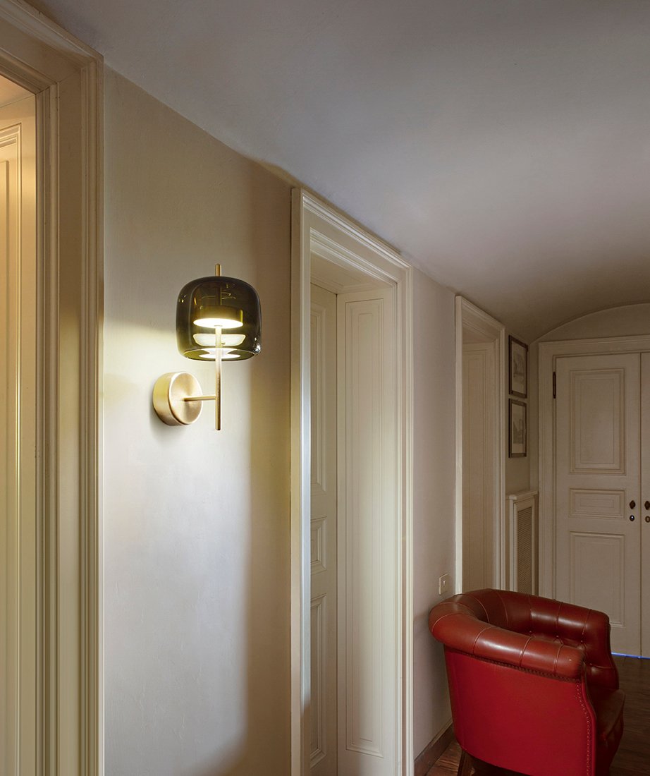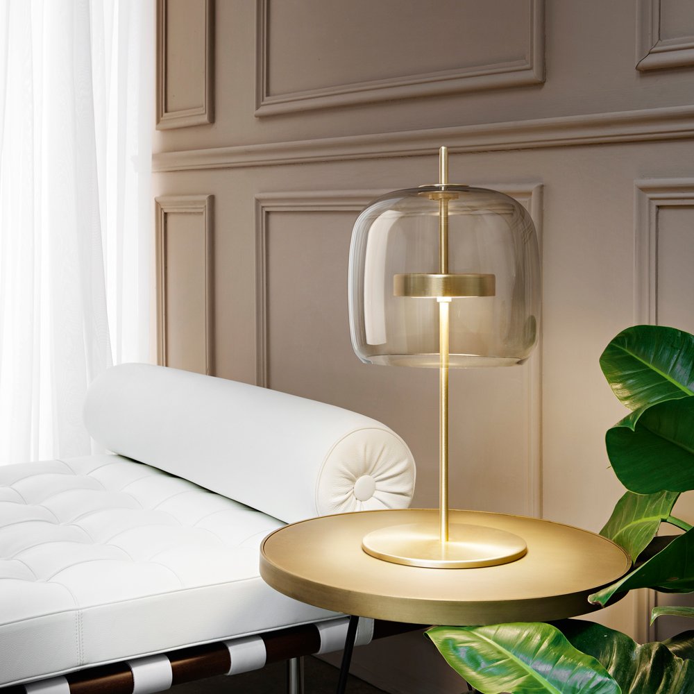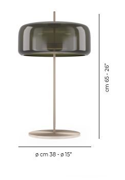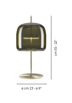 Jube, design Favaretto&Partners, è una collezione dal fascino vintage, composta da quattro tipologie: sospensione, parete, tavolo e terra, tutte con sorgente LED integrata. I diffusori sono disponibili in cinque finiture: ametista chiara, cristallo trasparente, fumè, marrone terra bruciata, verde antico. La montatura presenta tre possibili finiture: acciaio satinato, nero opaco, oro satinato.